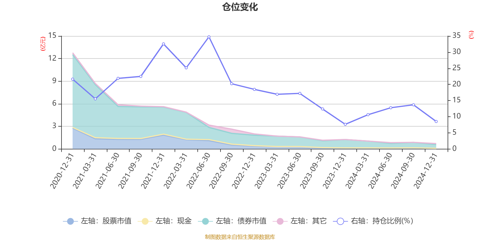 据定期报告数据统计,近三年平均股票仓位为16.53%,同类平均为18.69%。2022年上半年末基金达到34.74%的最高仓位,2023年末最低,为7.64%。