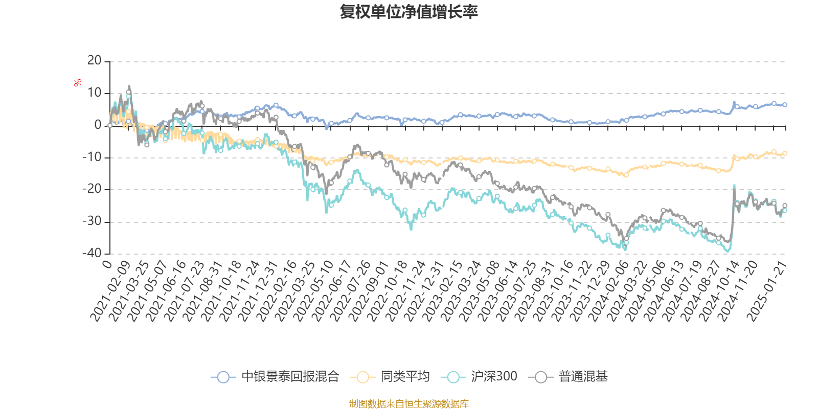 截至1月21日,中银景泰回报混合近三个月复权单位净值增长率为0.92%,位于同类可比基金404/670;近半年复权单位净值增长率为1.65%,位于同类可比基金540/670;近一年复权单位净值增长率为5.33%,位于同类可比基金449/664;近三年复权单位净值增长率为1.87%,位于同类可比基金283/525。